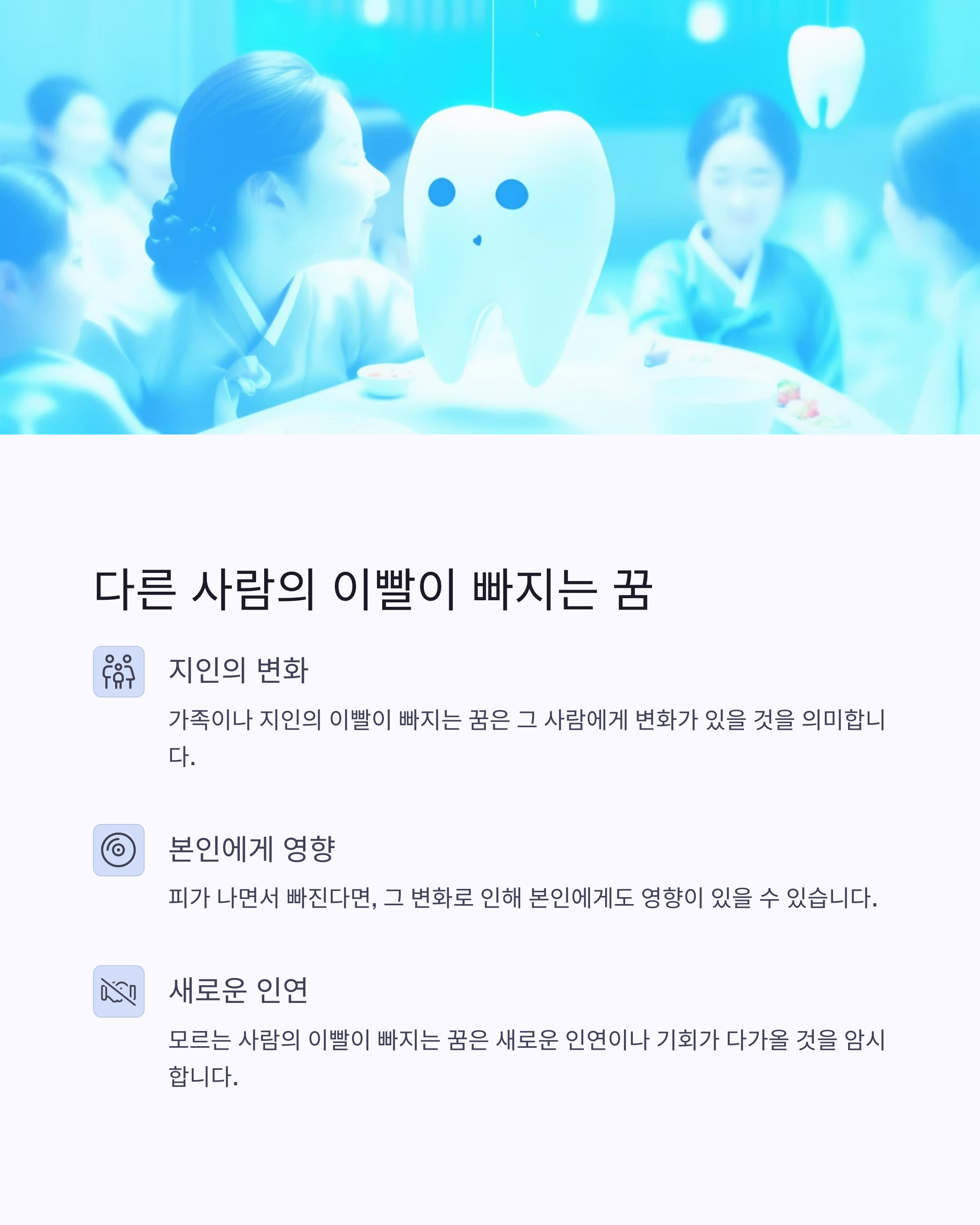 모르는 사람의 이빨이 빠지는 꿈은 새로운 인연이나 기회가 다가올 것을 암시하기도 합니다.