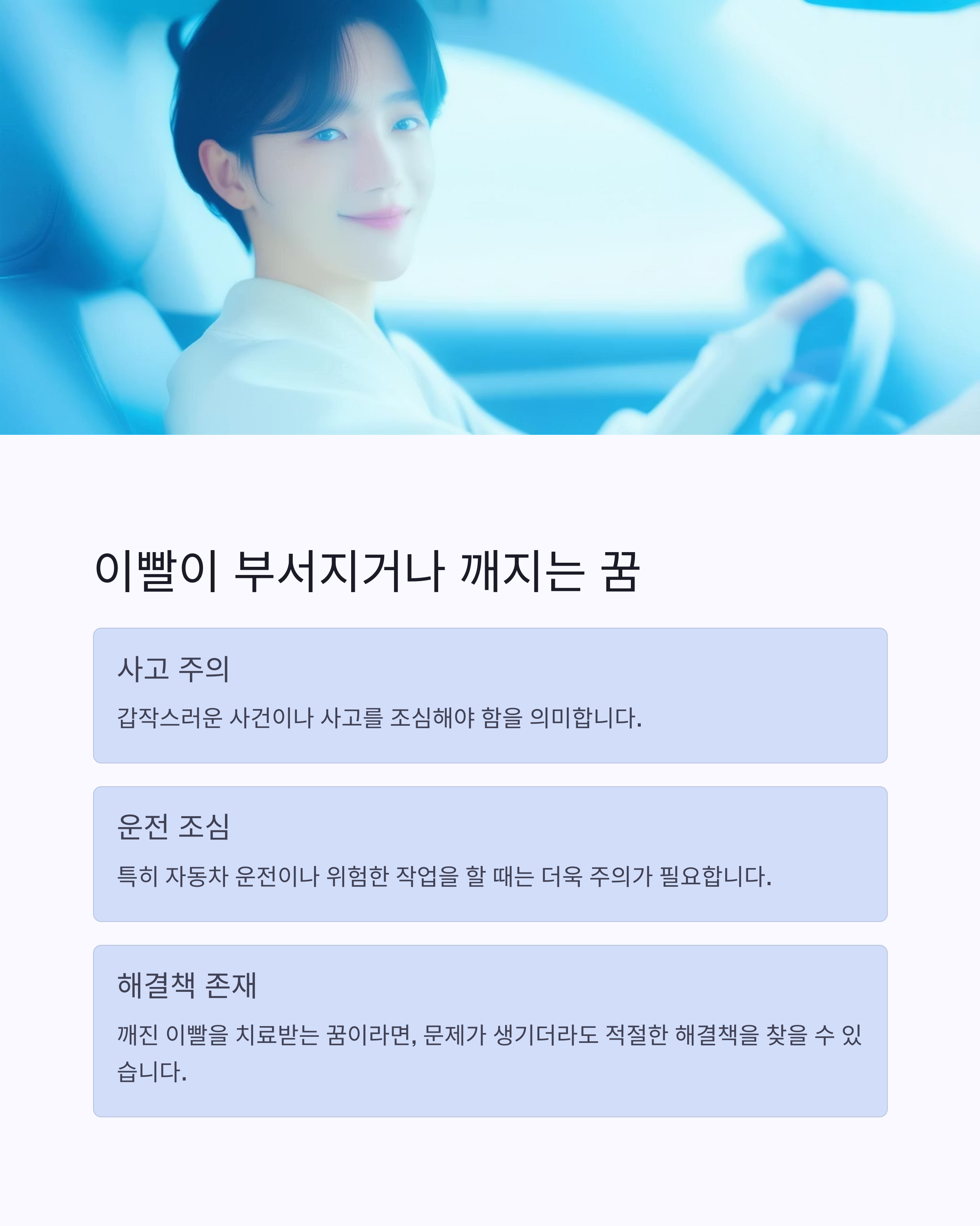 이빨이 깨지는 꿈은 갑작스러운 사건이나 사고를 조심해야 함을 의미합니다. 특히 자동차 운전이나 위험한 작업을 할 때는 더욱 주의가 필요합니다.