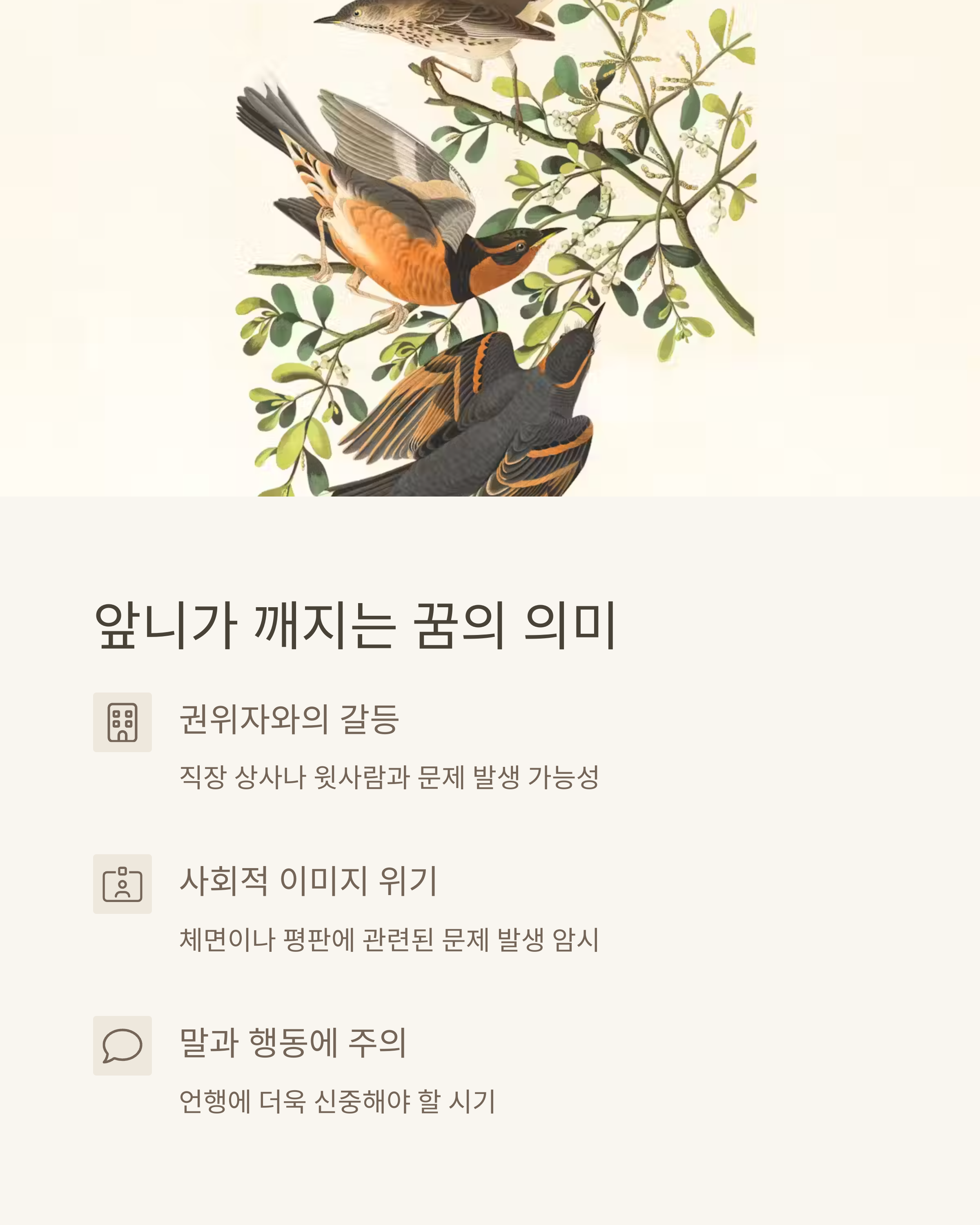 앞니 깨지는 꿈은 특히 권위 있는 인물과의 관계에서 주의가 필요함을 알려줍니다. 부모님이나 상사의 건강 상태도 한 번 확인해보시길 바랍니다.